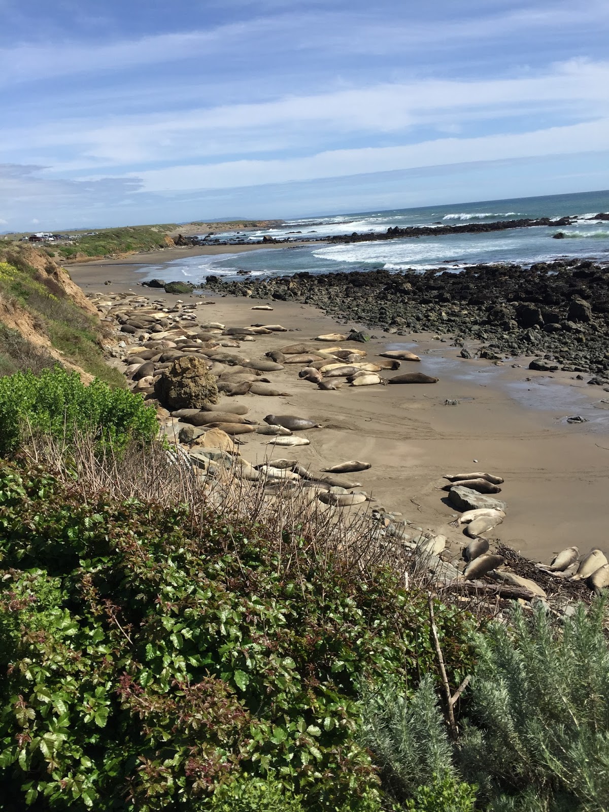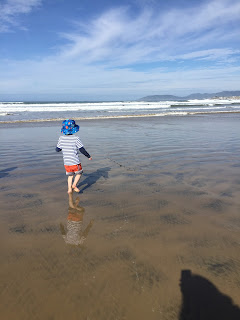 For our second day, we got up and had breakfast outside. Then, we went to the beach next to the hotel, and Brax got knocked down again by the waves. After a change, we went to Uncle Matt's and went to check out the sea otters. Then, the kids played at the pirate ship park. At lunch, we met Rufus the dog. Then, we drove to see the elephant seals. On the way back, we stopped at a beach at low tide, and there were hundreds of whole sand dollars being washed up. Brax loved helping me collect sand dollars which are on display in a glass fish jar at our home now. We ended the day by having a bucket dinner where they dumped out shrimp, crab, mussels, sausage, potatoes, and corn followed by a stop at the ice cream shop. Brax even tried calamari at lunch and dinner!